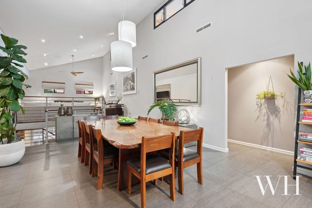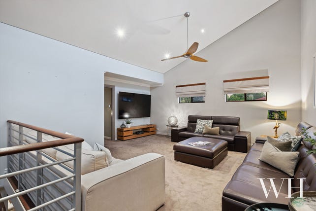 In their own private wing are three large bedrooms with built-in robes, ceiling fans and carpet, each sharing the family bathroom and separate WC, while the laundry leads to a drying courtyard out the back. The master suite offers great separation from the rest of the bedrooms - step up onto the carpeted lounge and through to complete tranquillity with all the trimmings: air-conditioning, walk-in robe, luxuriously appointed ensuite for two (with a deep-soak bath and rainwater shower) and double doors that open onto a sunny, north-facing deck. Below the lounge, stairs lead to the sprawling multi-purpose space, currently used as a home theatre and bar, with a pair of French doors leading to another courtyard – the perfect blank canvas to transform however you please.