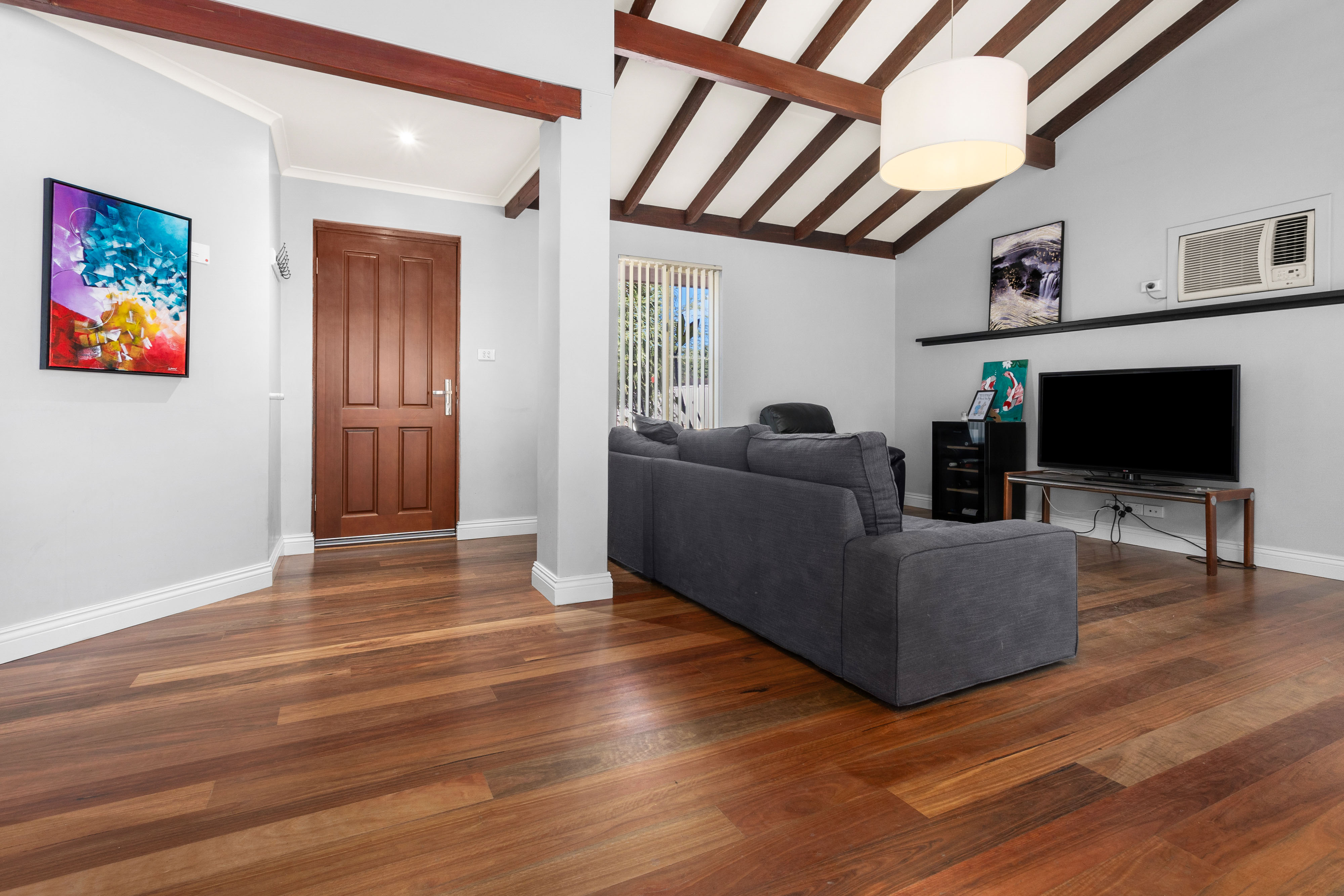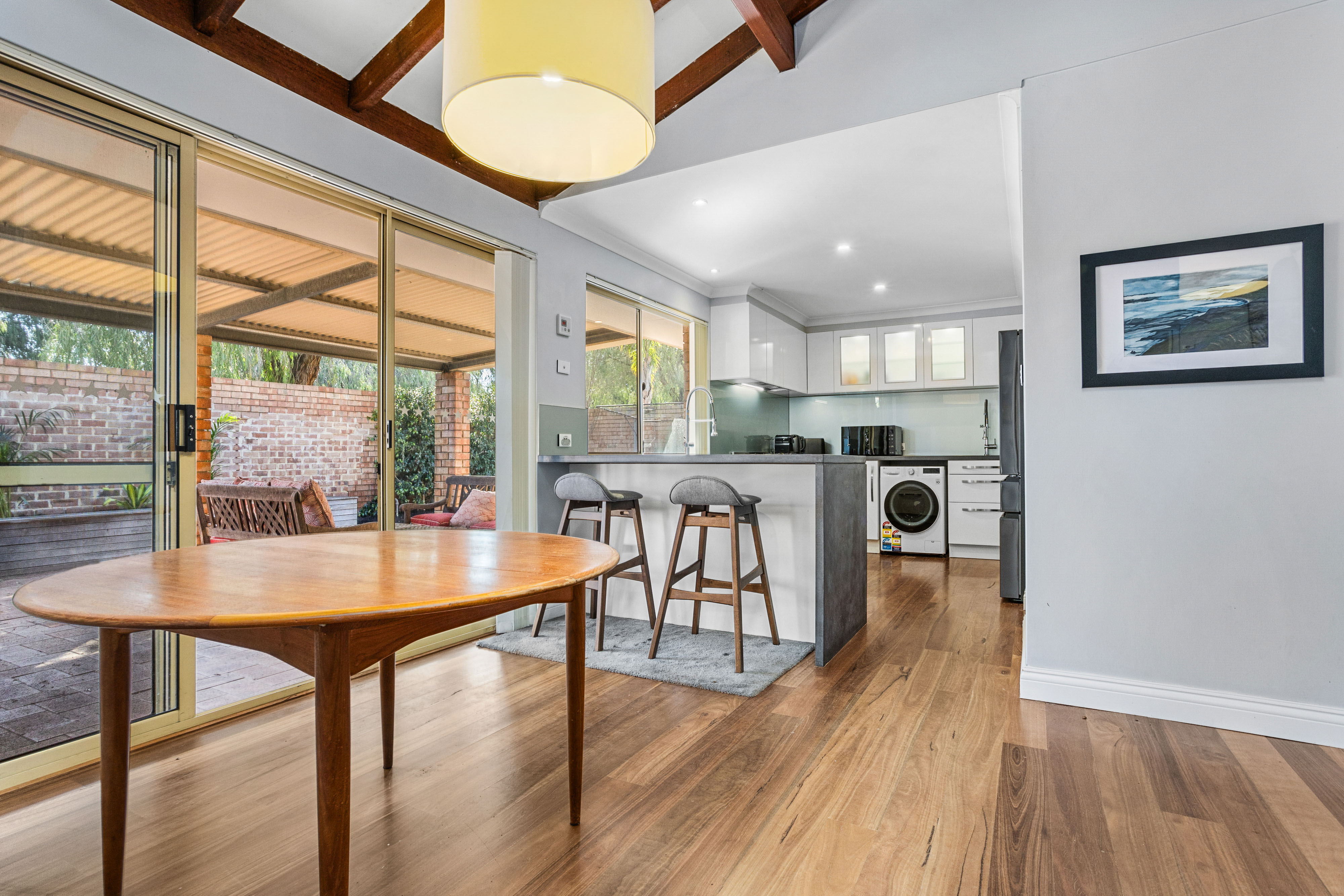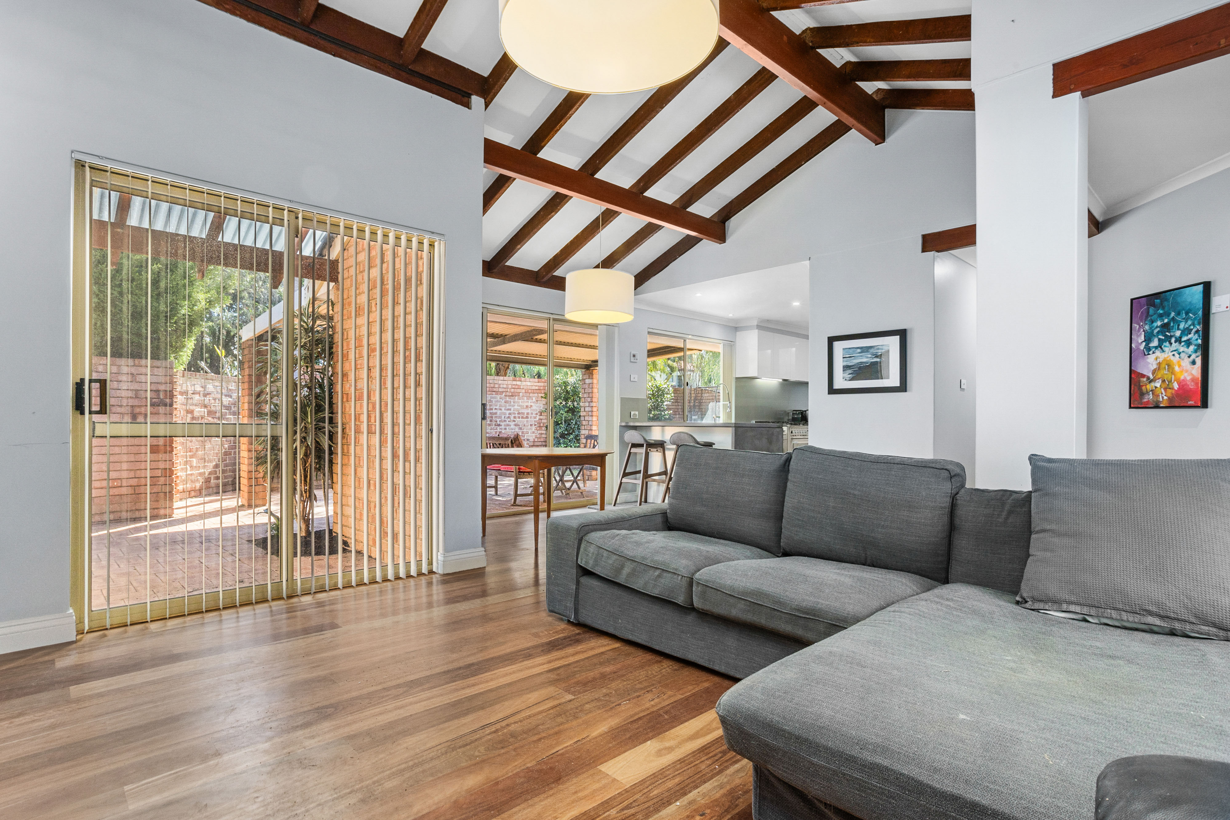 Nestled in a quaint complex of just three units, this gorgeous 3-bedroom, 1-bathroom home offers a blend of character and modern comfort in the highly sought-after riverside suburb of Bicton. Step inside to be greeted by stunning exposed rafters, high ceilings, and beautiful solid timber floors that run throughout the home, creating a warm and inviting atmosphere. The spacious open-plan kitchen boasts stylish concrete benchtops, a 900mm freestanding Ariston cooktop and oven, Euro laundry, walk-in pantry, and a large plumbed fridge space-perfect for home chefs and entertainers alike.