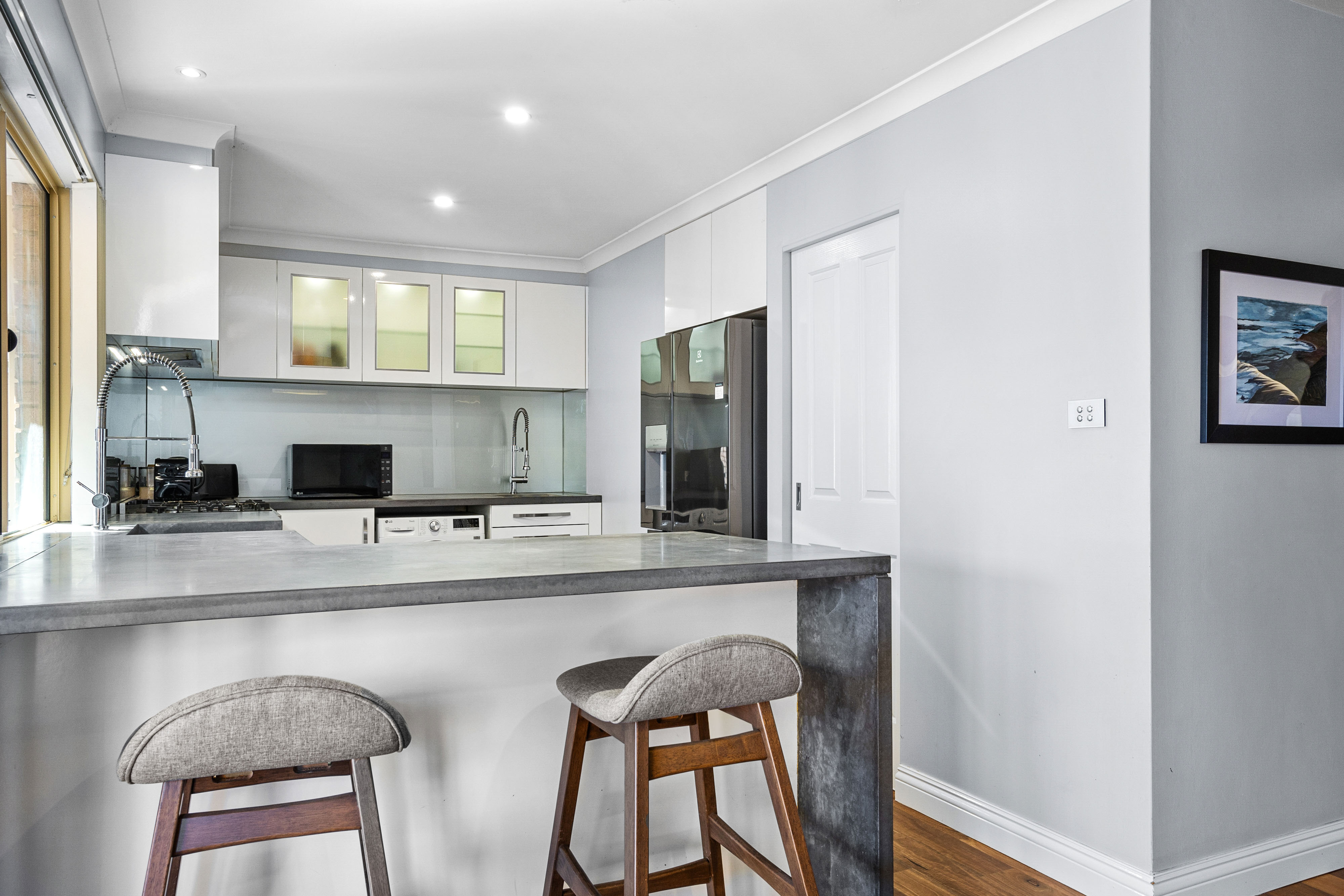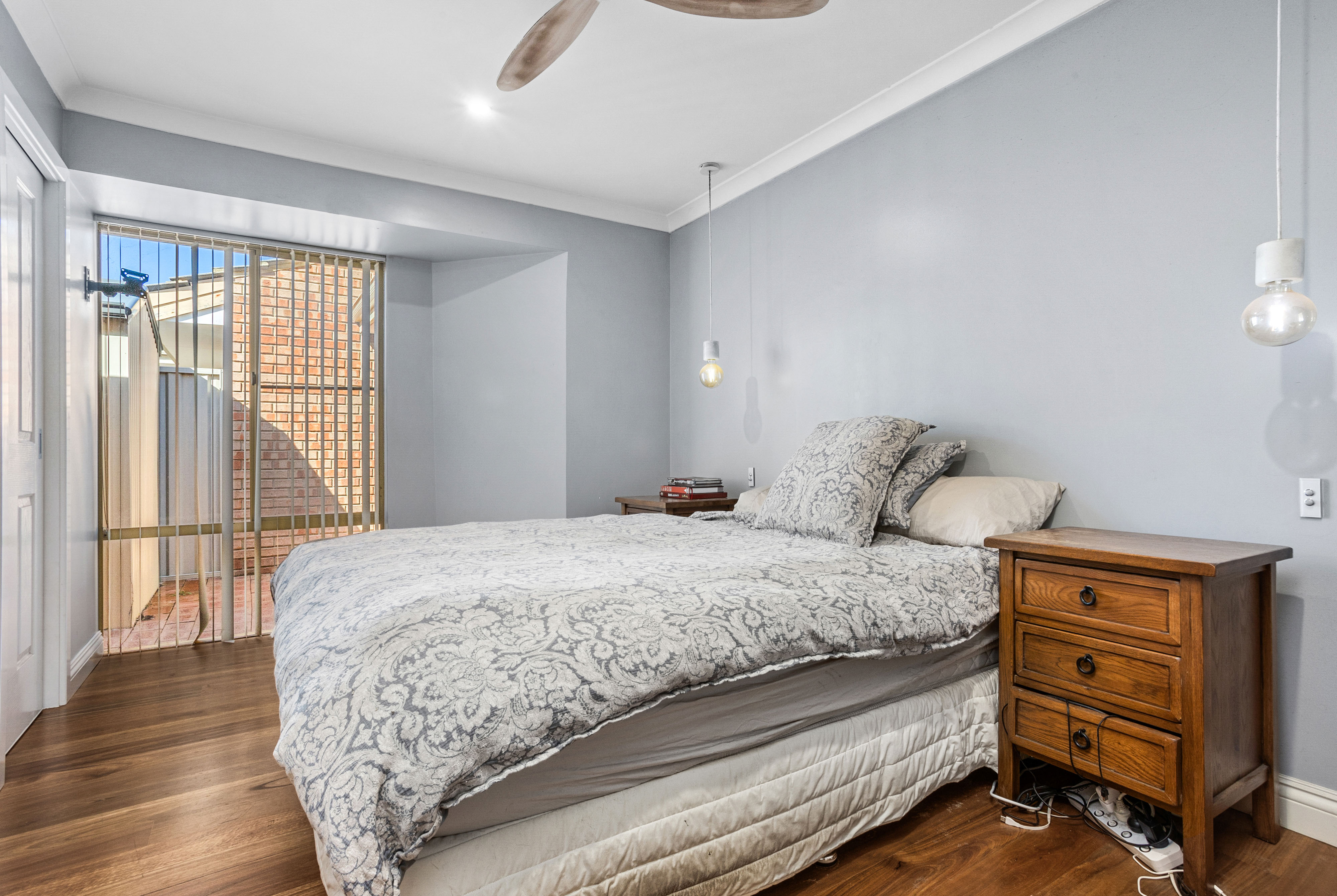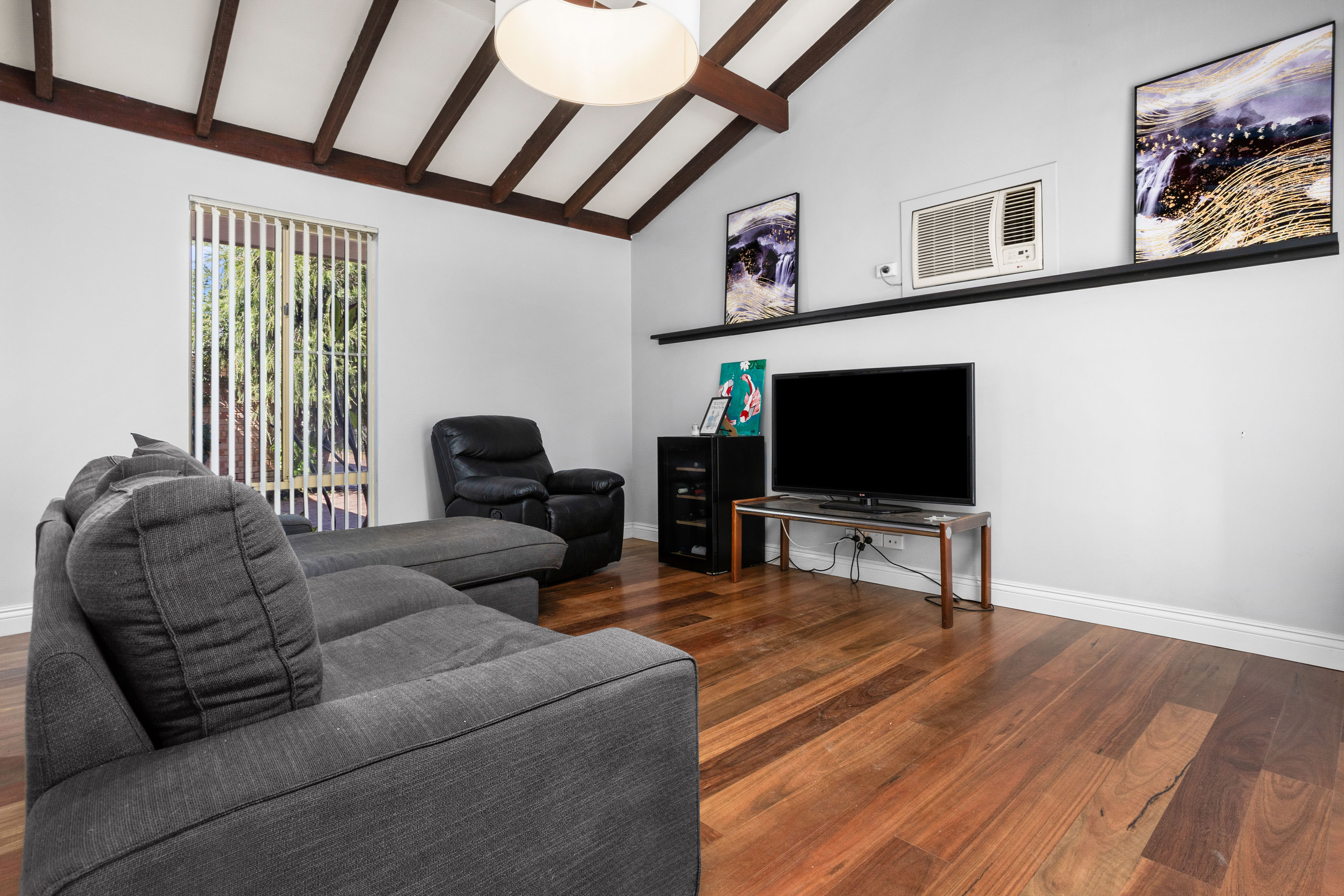 Nestled in a quaint complex of just three units, this gorgeous 3-bedroom, 1-bathroom home offers a blend of character and modern comfort in the highly sought-after riverside suburb of Bicton. Step inside to be greeted by stunning exposed rafters, high ceilings, and beautiful solid timber floors that run throughout the home, creating a warm and inviting atmosphere. The spacious open-plan kitchen boasts stylish concrete benchtops, a 900mm freestanding Ariston cooktop and oven, Euro laundry, walk-in pantry, and a large plumbed fridge space-perfect for home chefs and entertainers alike.