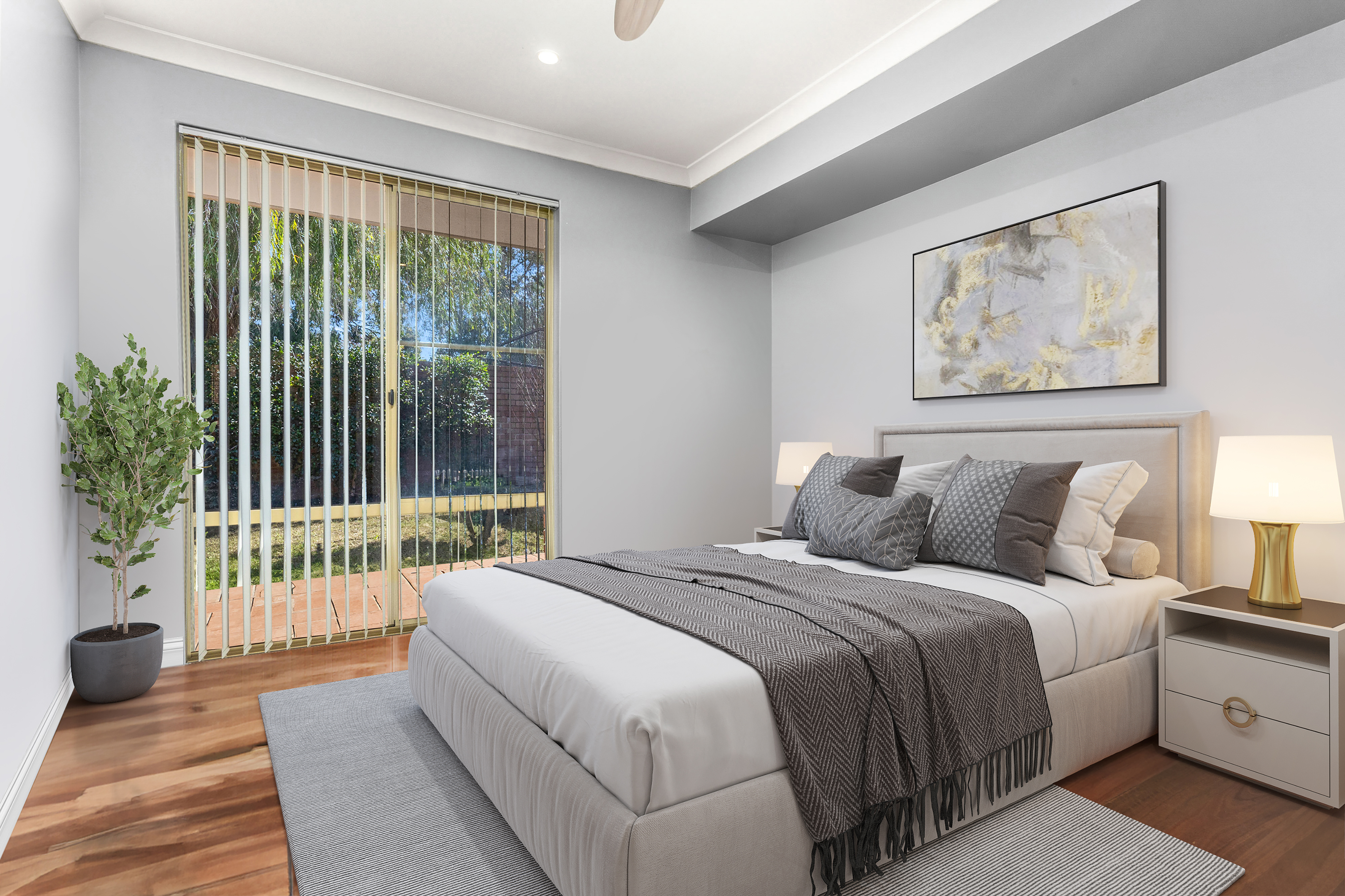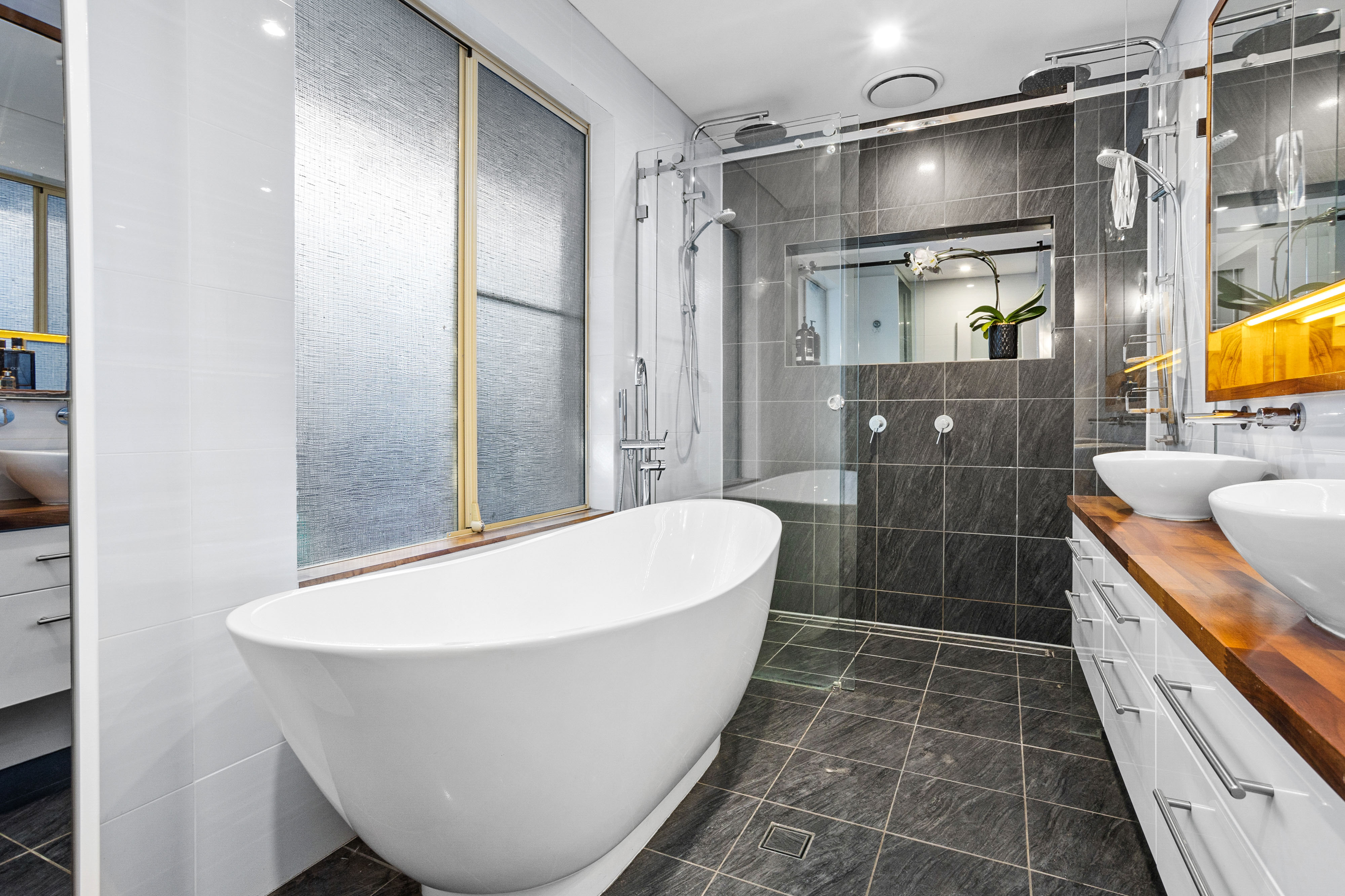 The main bedroom is a cosy retreat featuring a ceiling fan, walk-in robe, and built-in bedside lights, while the other two spacious bedrooms continue the home's timber flooring, with one bedroom also offering a ceiling fan for added comfort. The beautifully renovated bathroom is a standout, complete with a double vanity, deep freestanding bathtub, heated towel rail and a double shower with a sleek glass screen-truly a sanctuary to unwind in after a long day.