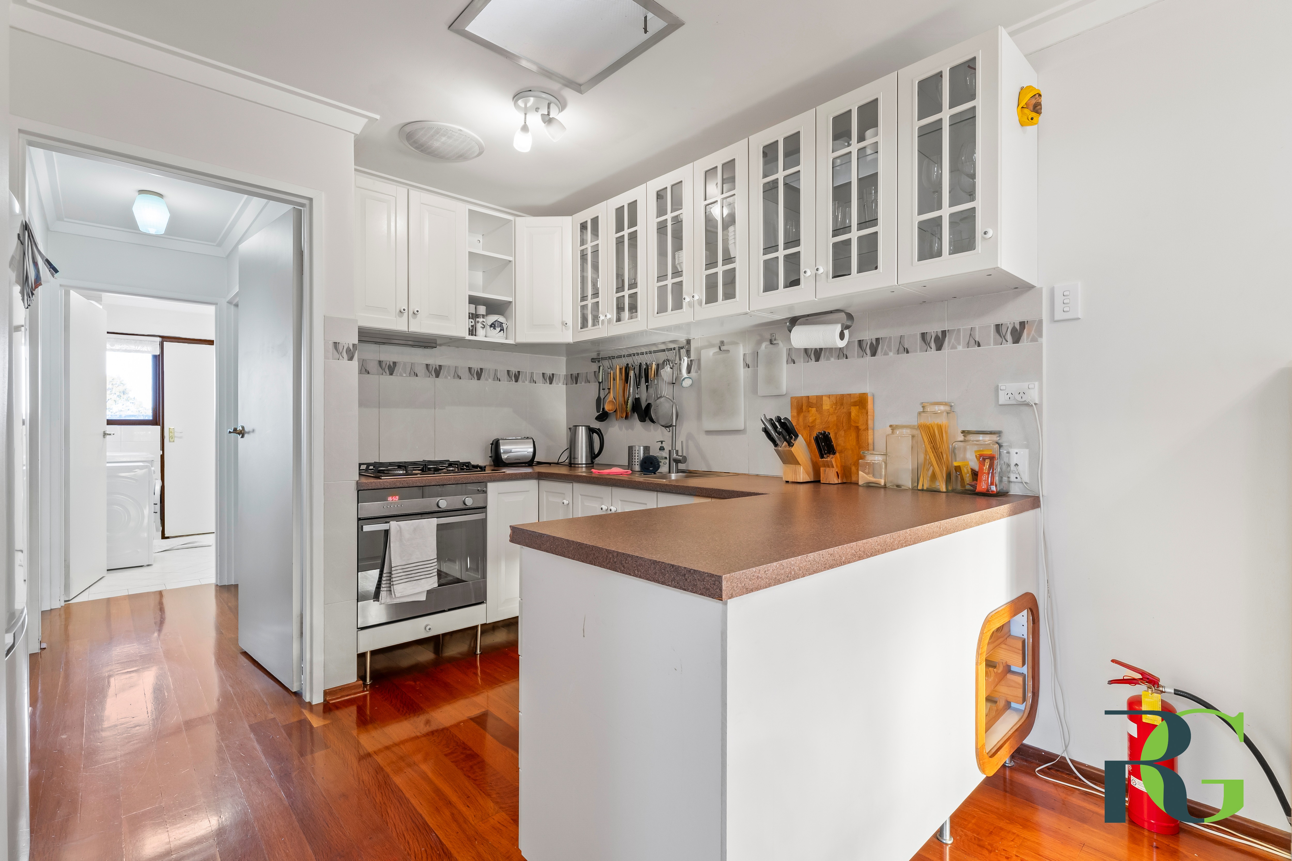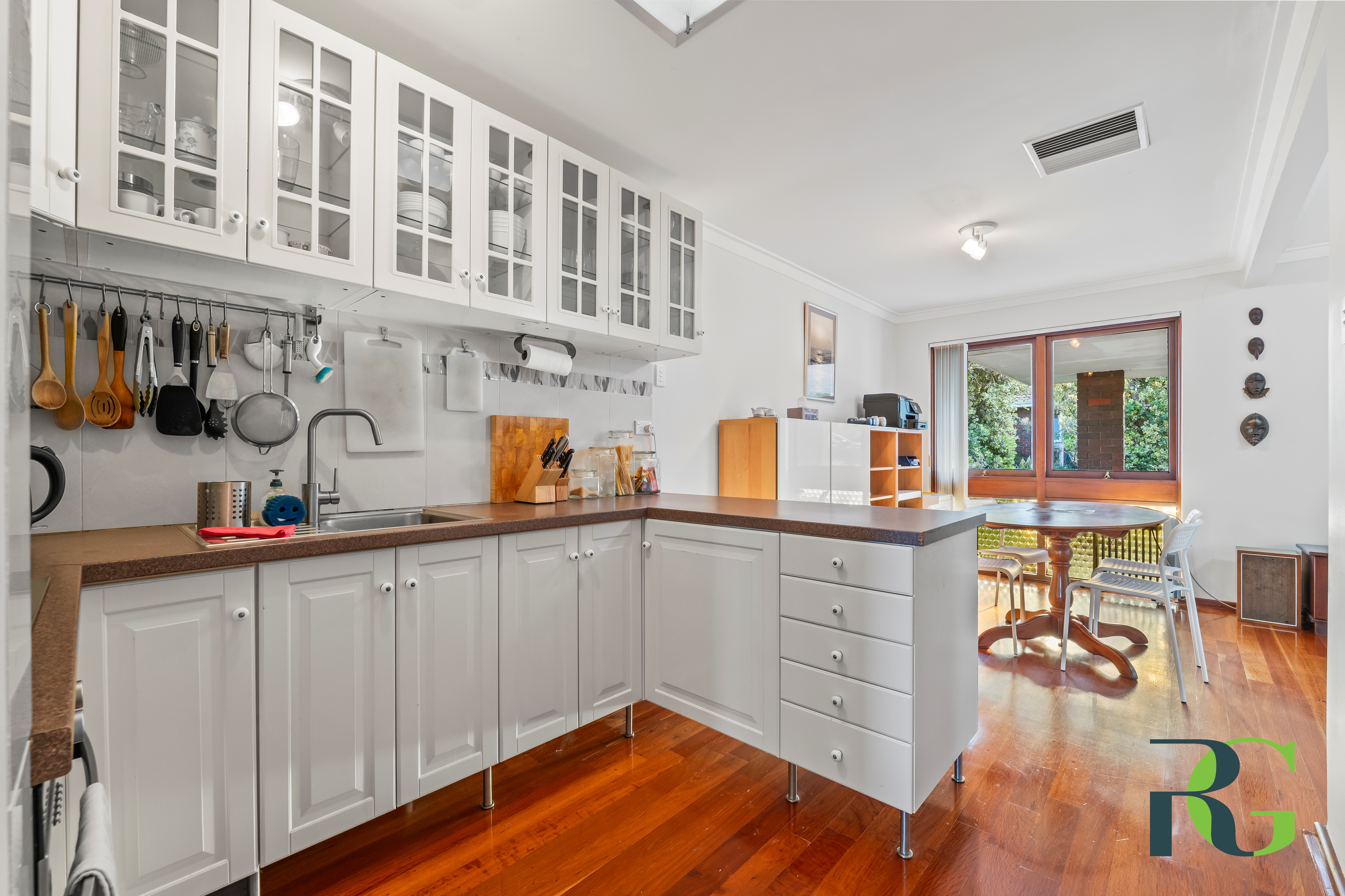 Upon entering, you'll be welcomed by a light-filled living area framed by elegant wooden windows with distinctive glass accents. The warmth of the polished floorboards creates a cosy, inviting atmosphere, seamlessly flowing into the dining and kitchen areas - ideal for everyday living and hosting family and friends.
